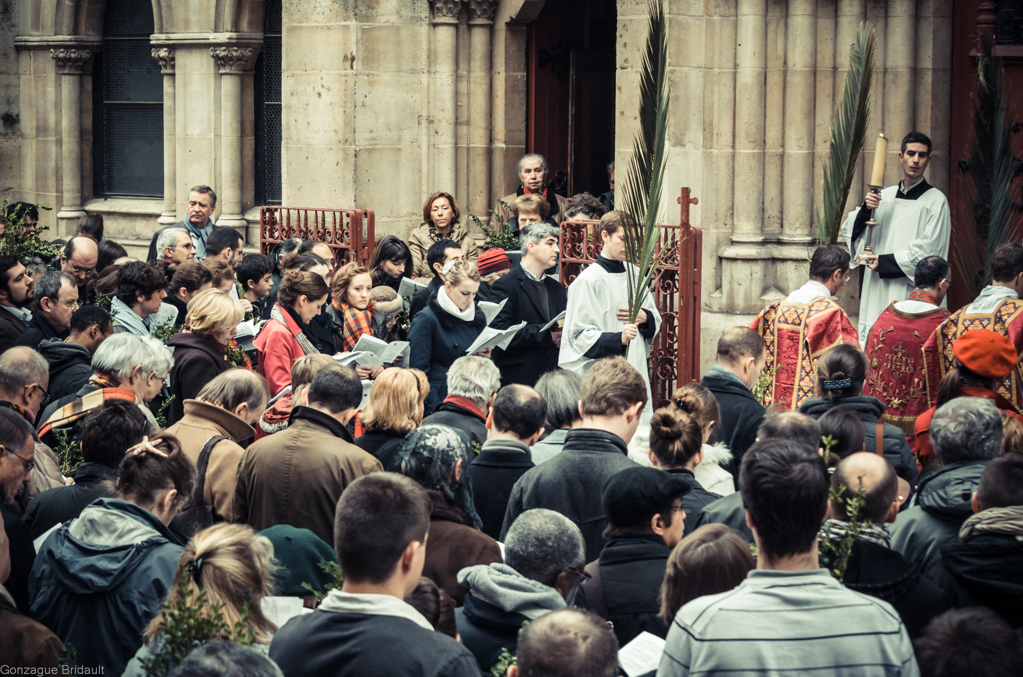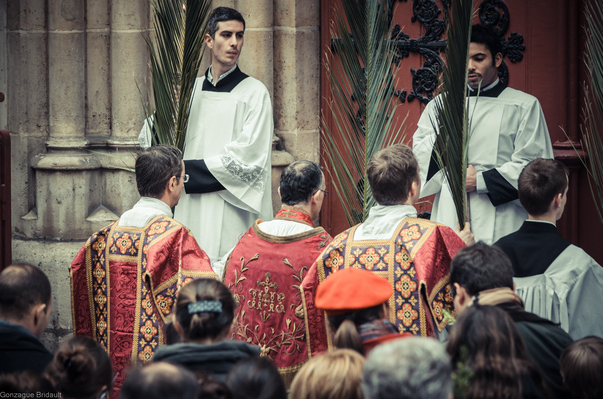 Station devant les portes fermées de l’église : le clergé et le peuple dialoguent le chant du Gloria laus avec les chantres restés à l’intérieur de l’église.